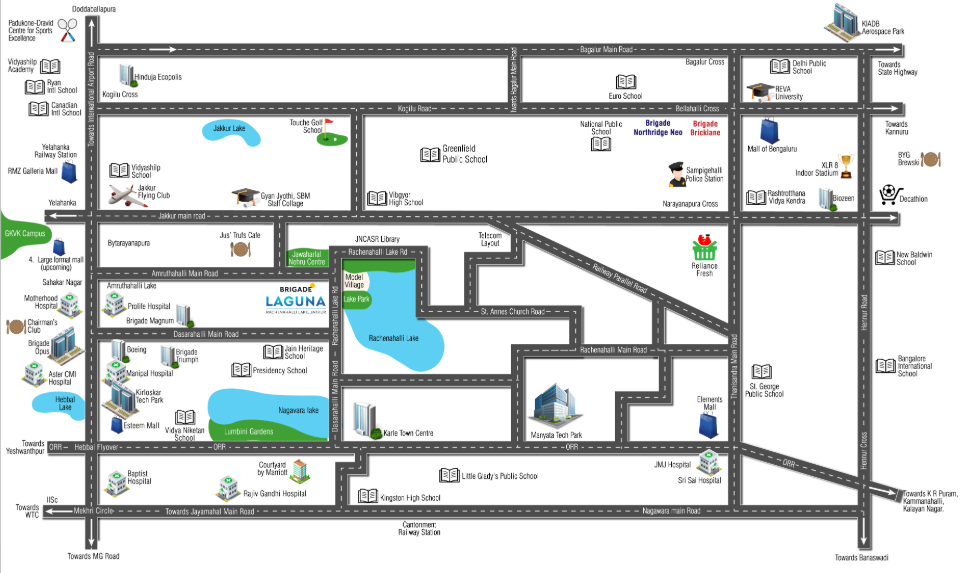 Brigade Laguna Location has excellent connectivity & it is located at the crux of Jakkur, Rachenahalli Lake off Hebbal, Bellary Road while being near existing and upcoming communities & facilities.
