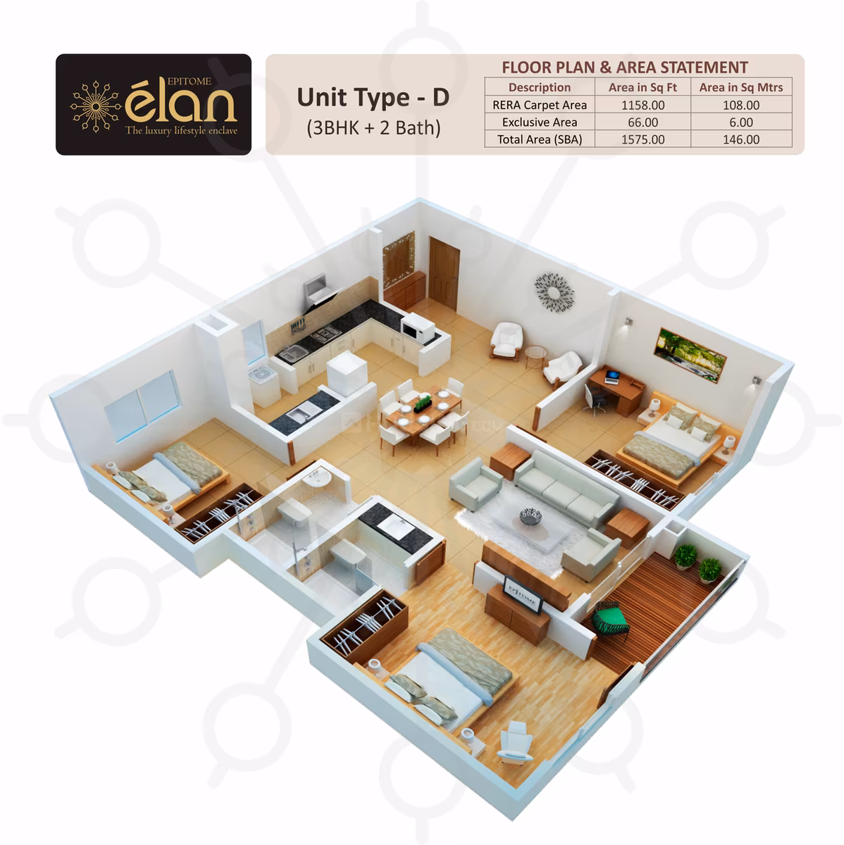 Spread out over a sprawling 2.5 acre property, the project offers 2 BHK & 3 BHK apartments starting from 1275sqft to 2050sqft with highest carpet area efficiency in the segment. Unmatched quality and value are accomplished through an integrated modern living concept, top of the line specifications, fittings & fixtures from international brands, and modular construction technology for speed, strength and stability. The unique architectural features of Epitome Elan include functional design and space planning for maximum natural lighting & ventilation, exquisite landscaped areas and large sit-out areas, and dry & wet concepts in kitchens and bathrooms.