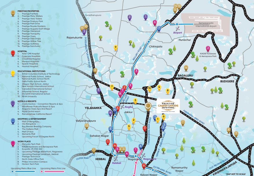 Prestige Camden Gardens Location has excellent connectivity & it is located at the crux of Thanisandra Road, Manyata Tech Park, Yelahanka, Bhartiya City, Hennur Road, Bagalur, and ORR near existing and upcoming communities & facilities.