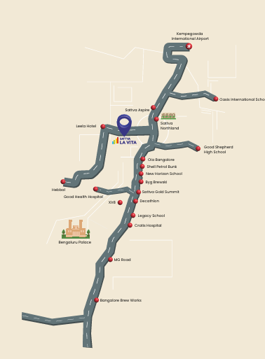 Sattva La Vita Location has excellent connectivity & it is located just off Hennur Main Road which is now known as “New Airport Road” and is well known for being close to Bhartiya City Township, Outer Ring Road, Manyata Tech Park, Bagalur, Thanisandra Road, Bangalore International Airport, Byg Brewski & Oia Brewhouses, and many other key locations in North Bangalore.