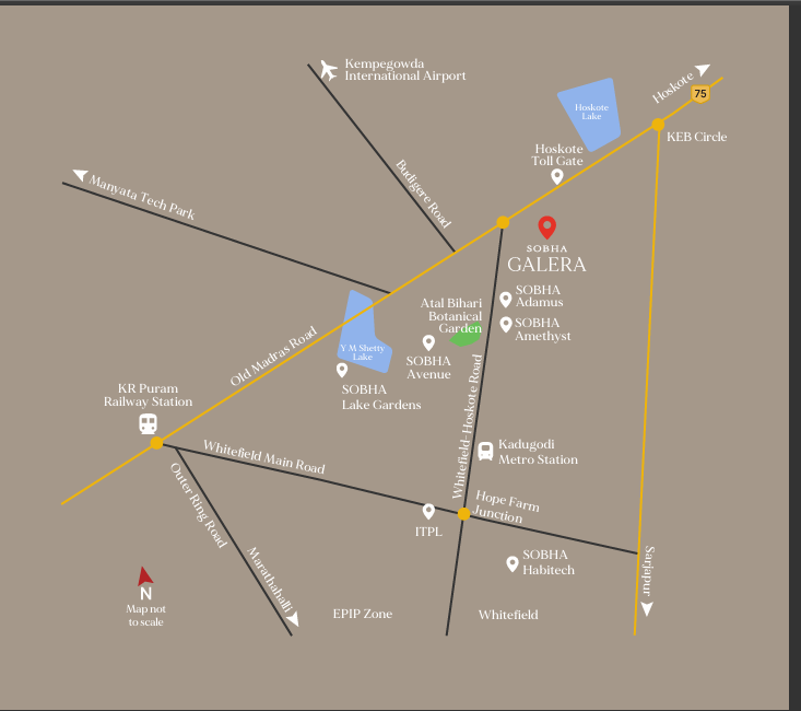 Sobha Galera Luxury Villas Whitefield Location has excellent connectivity & it is located at the crux of Whitefield Extension near Budigere Cross, Old Madras Road just a short drive from Hoodi, Kadugodi, KR Puram, and Outer Ring Road near existing and upcoming communities & facilities.