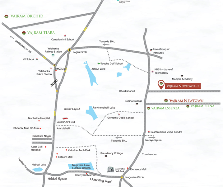 Vajram Newtown 2.0 Location has excellent connectivity & it is located at the crux of Thanisandra Road, Manyata Tech Park, Yelahanka, Bhartiya City, Hennur Road, Bagalur, and ORR near existing and upcoming communities & facilities.